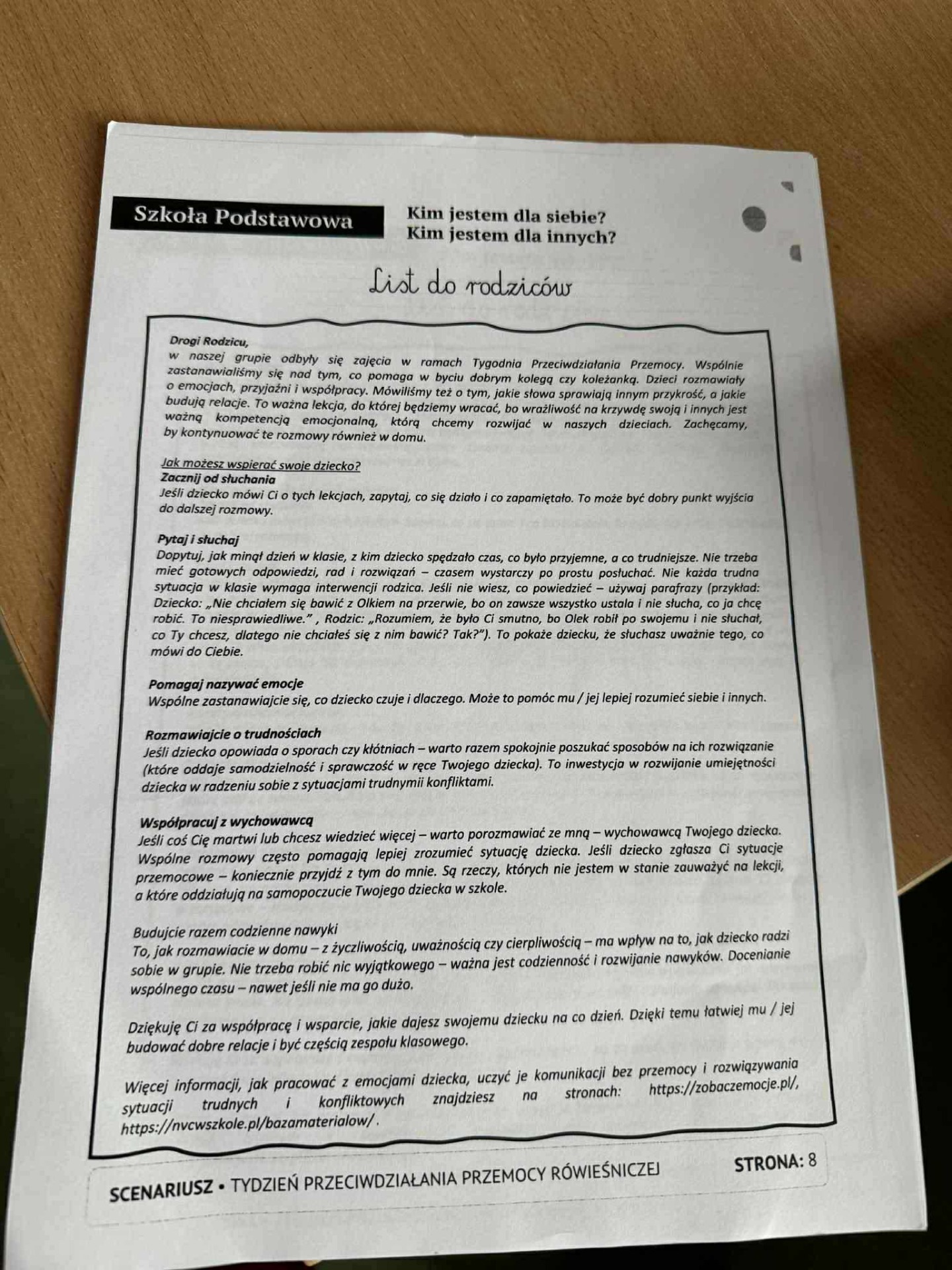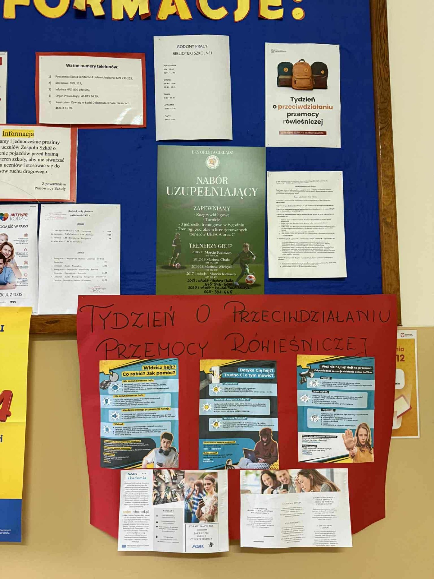 W dniach od 29.09.2025r. do 02.10.2025r. w naszej szkole odbył się Tydzień Przeciwdziałania Przemocy Rówieśniczej - cykl różnorodnych zajęć edukacyjnych, inicjatyw których celem było uświadamianie problemu przemocy słownej, fizycznej, psychicznej oraz cyberprzemocy wśród dzieci i młodzieży, rozwijanie postaw empatii, asertywności oraz wzajemnego szacunku. W trakcie Tygodnia w naszej szkole zrealizowano m. in. zajęcia z psychologiem szkolnym, pedagogiem oraz pedagogiem specjalnym, pogadanki z wychowawcami na godzinach wychowawczych, przygotowano również plakaty dotyczące przemocy oraz przeprowadzono warsztaty dotyczące depresji w klasach VII oraz VIII. Warsztaty poprowadził Pan Marcin Rakowski - Psycholog z Poradni Psychologiczno - Pedagogicznej w Rawie Mazowieckiej. Organizacja Tygodnia Przeciwdziałania Przemocy Rówieśniczej była ważnym krokiem w budowaniu bezpiecznej, życzliwej społeczności szkolnej. Zapraszamy wszystkich do wspólnej troski o to, by nasza szkoła była miejscem bezpiecznym pełnym szacunku i wsparcia.