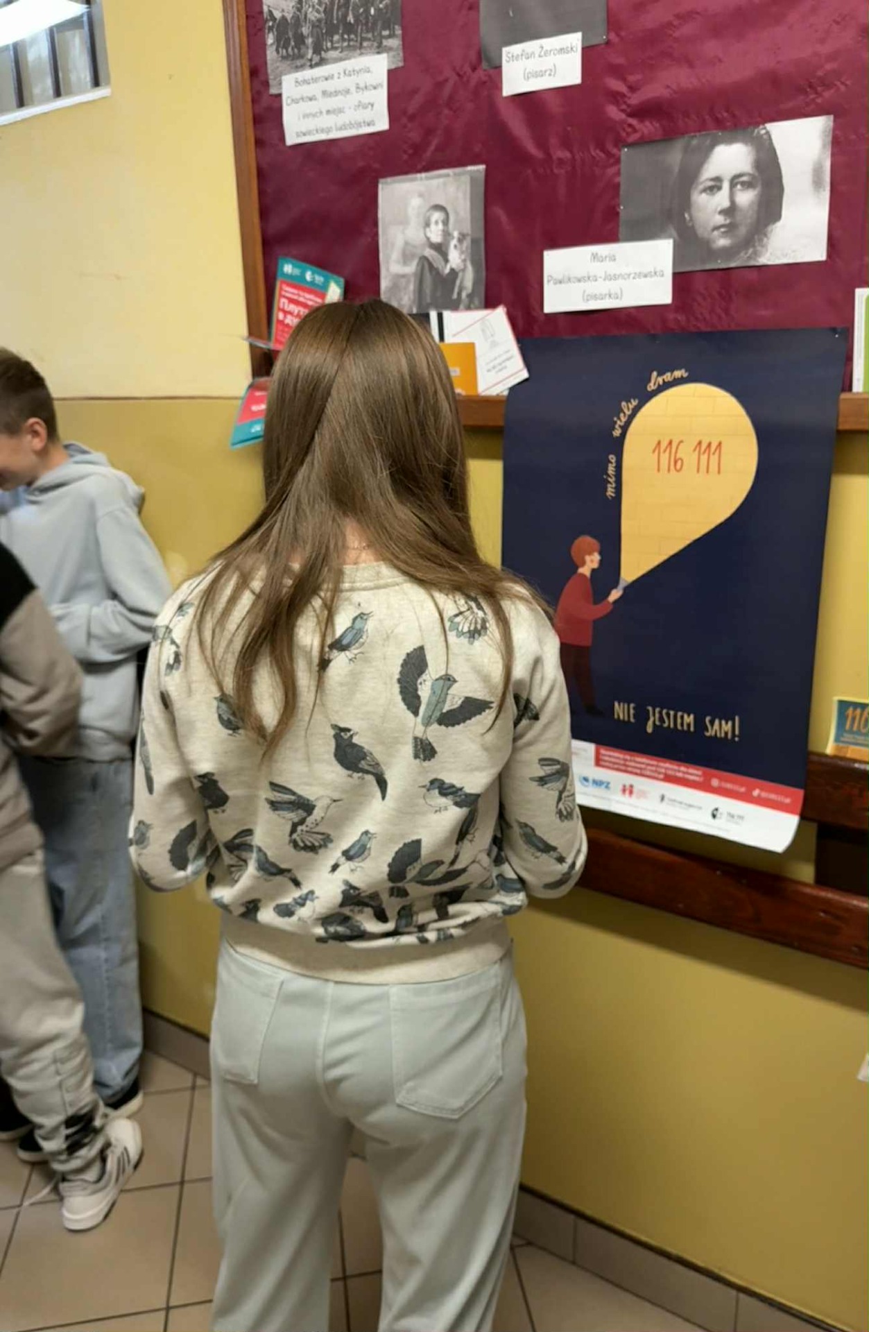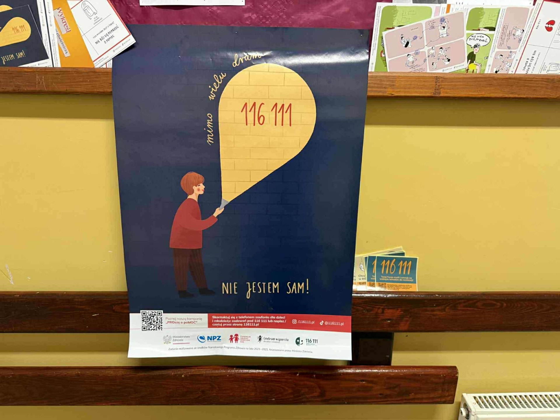 Nasza szkoła wraz z Fundacją Dajemy Dzieciom Siłę (@FundacjaDajemyDzieciomSiłę) dba o to aby dzieci wiedziały, gdzie i w jaki sposób mogą zgłosić się o pomoc. Otrzymaliśmy materiały promujące kampanię „Proszę o pomoc”, które zostały rozłożone w widocznych dla naszych uczniów miejscach. W zestawie znalazły się plakaty, pocztówki i wlepki, zachęcające do sięgania po wsparcie i kontaktu z telefonem zaufania dla dzieci i młodzieży 116 111.
